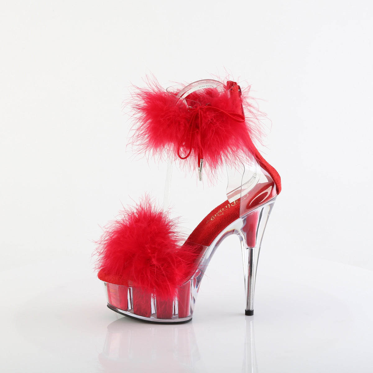 Calzado acrílico de taco 4.5 cm y plataforma 15 cm, con tobillo cerrado en la parte posterior con cordones laterales con piel de marabú en el empeine y en la parte inferior de la plataforma. Cierre con cremallera trasera.